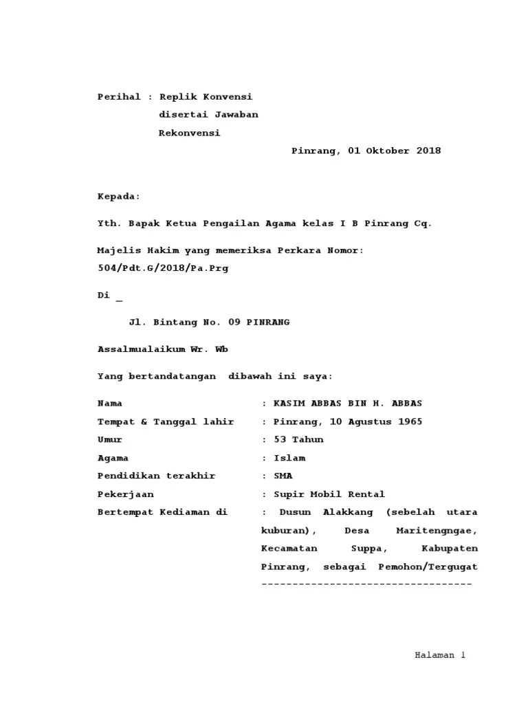 .eksepsi, jawaban tergugat dan gugatan rekovensi dalam perkara perdata register nomor : Jawaban dalam konpensi dan gugatan dalam rekonpensi. Kepada yth, majelis hakim yang memeriksa. Surat gugatan adalah suatu surat gugatan perdata yang diajukan oleh penggugat atau kuasa penggugat kepada ketua pengadilan. Selanjutnya mohon disebut sebagai….tergugat rekonpensi.